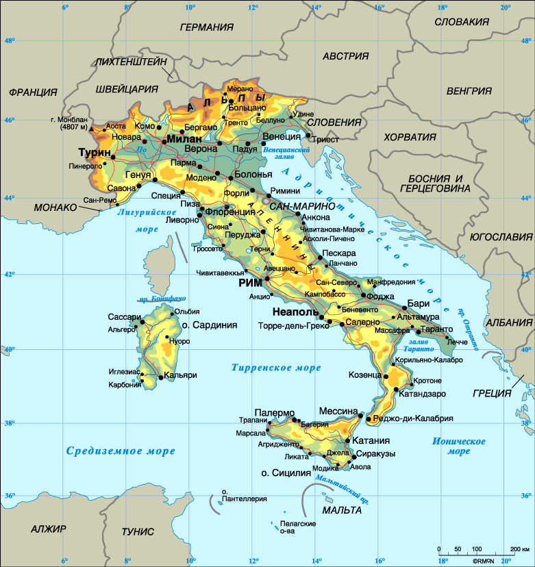 ИталияИталия, имеющая форму сапога, на карте сразу же бросается в глаза. Она расположена между Адриатическим, Ионическим, Лигурийским и Тирренским морями, каждое из которых является частью Средиземного моря. Граничит с Францией, Швейцарией, Австрией и Словенией. Острова Эльба, Сардиния, Искья, Капри, Сицилия и Липарские острова распложены на большом расстоянии от материка. Хребет Италии формируют Апеннины, тянущиеся от Генуи вниз практически до Сицилии. Долина реки По на северо-востоке образует самую крупную низменность, где расположены самые густонаселенные промышленные районы. Благодаря трем активным вулканам - Стромболи на Липарских островах, Везувию недалеко от Неаполя и Этне на Сицилии - в стране иногда происходят подземные толчки и землетрясения.