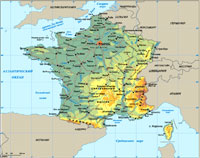 Франция является самой крупной страной Западной Европы и одна из главных экономических и политических мировых сил. Она граничит с Испанией, Италией, Германией, Швейцарией, Бельгией и Люксембургом. Французы иногда называют свою страну Гексагоном (Шестиугольником) из-за ее формы. Имея большую площадь в 544 тыс.км.кв, Франция еще имеет владения в Тихом, Атлантическом и Индийском океанах. Омывается Северным морем, Ла Маншем, Атлантическим океаном и Средиземным морем. Самая длинная во Франции река Луара тянется на 1012 км. 2/3 общей площади занимают равнины. Страна охвачена горными массивами, среди которых Альпы, Пиренеи, Юрские горы, Арденны и Вогезы. Во французских Альпах находится самая высокая вершина в Западной Европе Монблан (4 807 м).