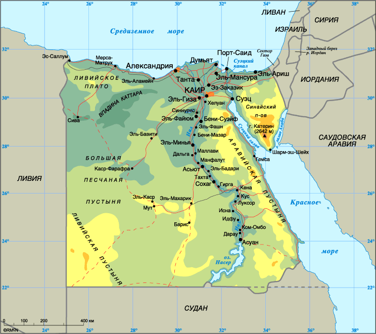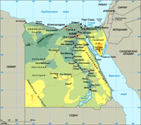Египет - одно из крупнейших арабских государств, общей площадью - 101,4 тыс. кв. км. Расположено на двух континентах - большая часть страны лежит в Северо-восточной Африке вдоль реки Нил, а Синайский полуостров находится в Азии. С севера берега Египта омываются Средиземным морем, на востоке - Красным морем. Граничит с Израилем на северо-востоке, на западе - с Ливией, на юге - с Суданом. Более 90% Египта - пустынные районы с редкими оазисами, значительная часть страны лежит достаточно высоко над уровнем моря. В Египте жаркий и засушливый климат, и только узкая полоса северного побережья страны лежит в зоне средиземноморского климата. Но в весенний период появляются юго-восточные горячие и сухие ветры из пустыни - "хамсин". Температура воздуха во время хамсина повышается до 40 °C, влажность падает до 10%.