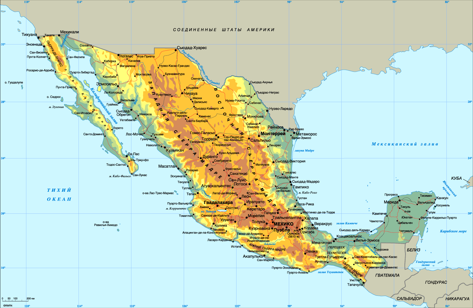 Государство находится в Северной Америке, занимая практически всю её центральную часть. Занимая территорию почти 2 млн. кв. км, Мексика по форме напоминает петлю, вытянутую с северо-запада на юго-восток, и снова расширяясь на Юкатане. На западе и юге территорию Мексики омывает Тихий океан. Восточный берег Мексики омывается водами Мексиканского залива, а восточный берег Юкатана выдается в Карибское море. Сухопутные границы страны отделяют ее от США на севере и от Гватемалы и Белиза на юго-востоке. Мексике принадлежит целый ряд островов в Тихом океане и Карибском море. В рельефе преобладают горные массивы. Равнины и низины полуострова Юкатан покрыты тропическими саваннами.