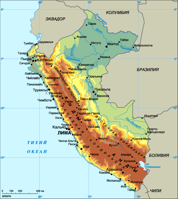 ПеруСамый удивительный и многообразный ландшафт в Южной Америке можно найти именно в Перу. Несомненно, перуанские Анды - самые красивые горы на континенте, и там живут миллионы высокогорных индейцев, которые все еще говорят на древнем языке кечуа и ведут свой традиционный образ жизни. Перу находится на западе Южной Америки и имеет границы с Чили (на юге), Боливией (на юго-востоке), Бразилией (на северо-востоке), Колумбией (на севере) и Эквадором (на северо-западе). На его территории (1 285,215 кв. км) могут свободно разместится Франция, Испания и Италия вместе взятые. Оно состоит из трех основных районов: узкого побережья, широкого Андского хребта и равнины Амазонки. Побережье, в основном, составляет пустыня, но на ней расположены самые крупные города Перу и знаменитое Панамериканское шоссе. Анды состоят из двух хребтов: Западного и Восточного, к последнему относится высочайшая гора в Перу Уаскаран (6770 м над уровнем моря). На востоке лежит тропическая равнина Амазонки и реки Мароньон Укаяли.