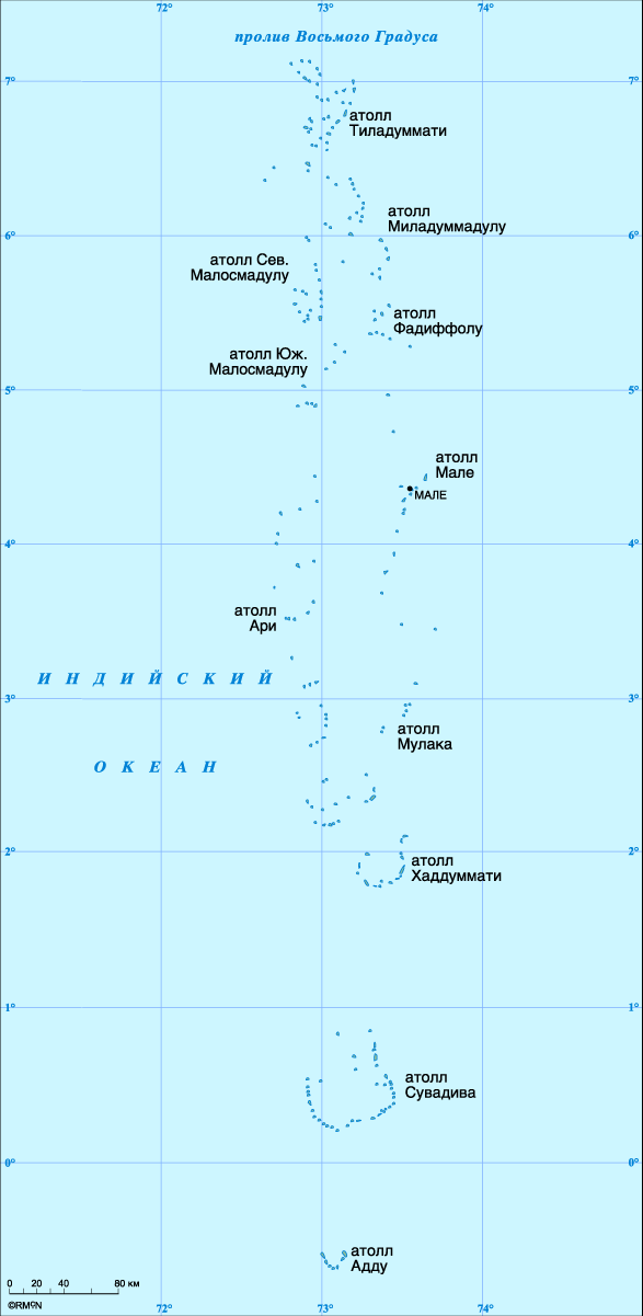 Мальдивы представляют собой цепь из 26 коралловых атоллов в Индийском океане к юго-востоку от Шри-Ланки, протянувшихся через экватор с севера на юг на 754 километра и с запада на восток на 118 километров. 1192 островка настолько маленькие, что земля составляет менее 4% общей территории страны. Некоторые острова представляют собой только песчаные насыпи, а другие, периметр которых равен нескольким километрам, покрыты буйной растительностью.