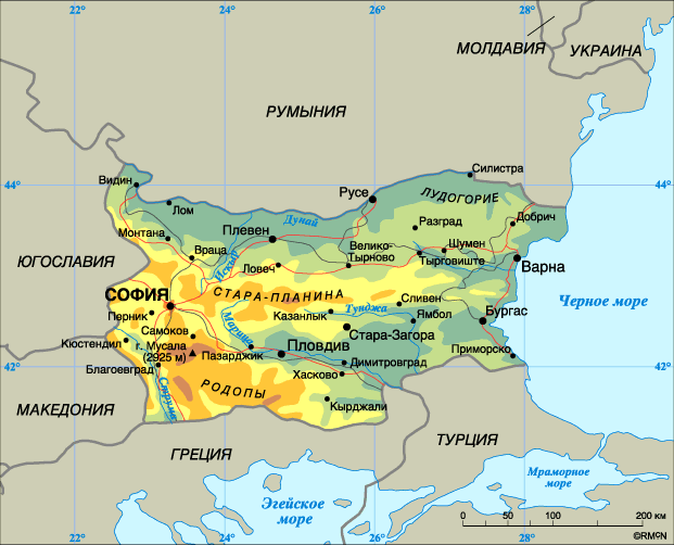 БолгарияСтрана известна на всю Европу своими живописными ландшафтами, морскими курортами Черноморского побережья, обилием исторических памятников и красочными народными обрядами. Болгария, общей площадью 110,9 тыс. кв. км, расположена на юго-востоке Европы, на Балканском полуострове и граничит с Румынией, с Турцией, Грецией, с Сербией и Македонией. Начиная с берегов Дуная, опустошаемые ветрами плоскогорья переходят в вершины Стары Планины. Этот хребет тянется с востока на запад через северную часть страны с Черного моря до Сербии. Южная Болгария еще более гориста. Самая высокая гора Болгарии - вершина Мусала (2925 метров над уровнем моря) в хребте Рил к югу от Софии, а вторая чуть южнее - вершина Вихрен (2915 метров над уровнем моря) в Массиве Пирин. Хребет Родопы тянется вдоль границы с Грецией. Север страны занят Нижнедунайской равниной, а на юге - обширная низменность Фракия.